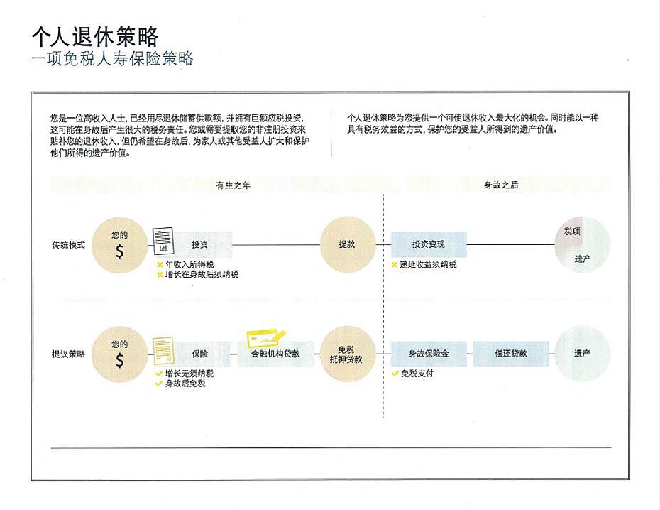 例如:有健康的身体和保险需求,45岁,男性,每年投资$34,035, 投资20年,即使按3%投资增长,每年取近$70,000, 也只能取到77岁。而运用个人退休策略,从66岁到90岁,每年用保单抵押贷款$70,000,到85岁时,即使减去所有贷款及利息,还可以给受益人留下$1,000,000.