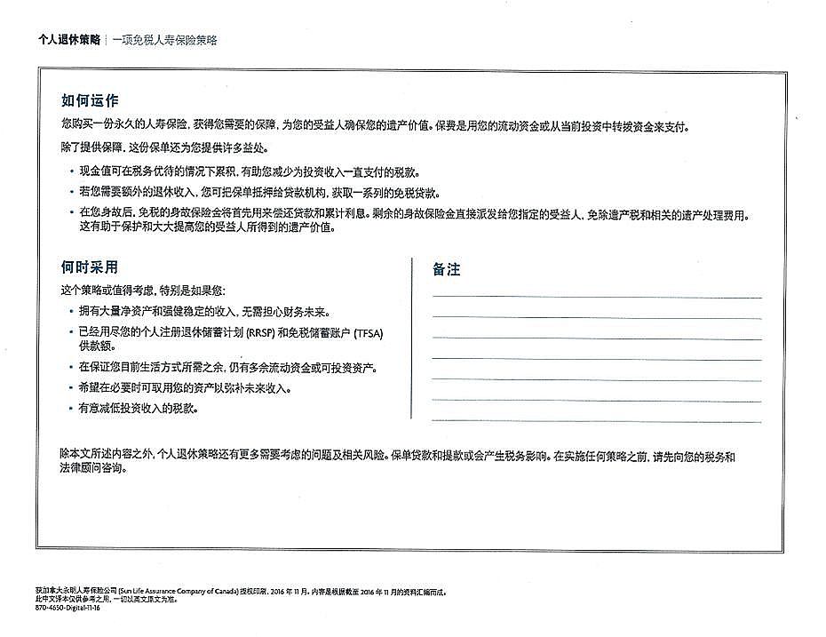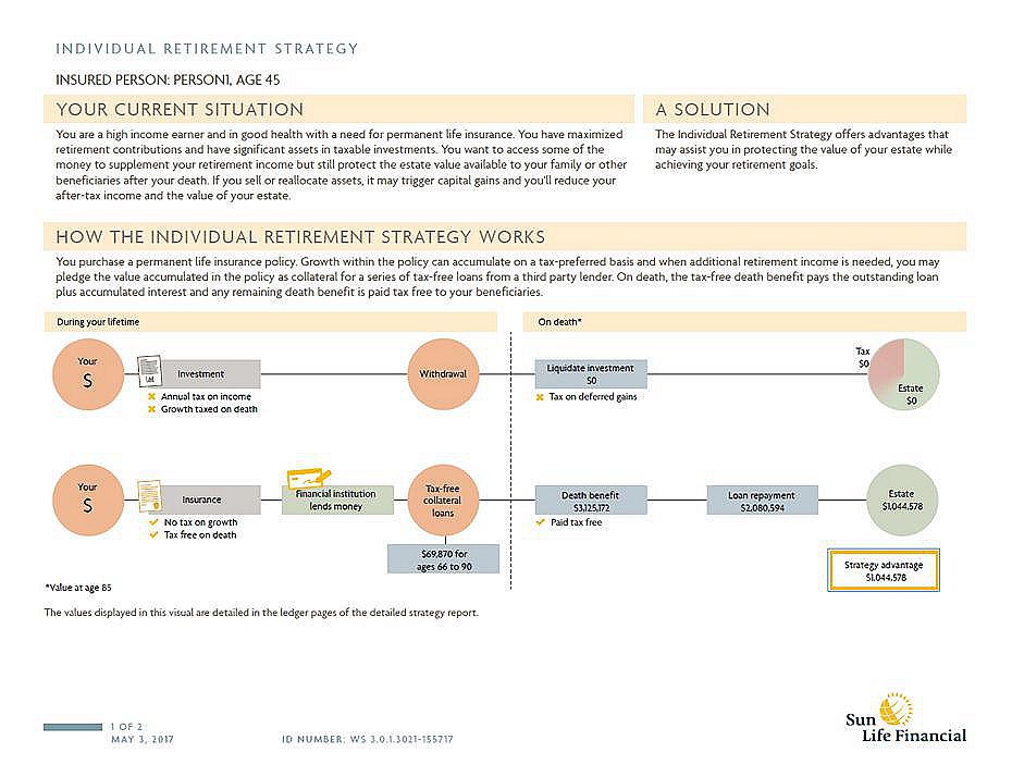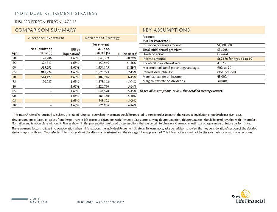 例如:有健康的身体和保险需求,45岁,男性,每年投资$34,035, 投资20年,即使按3%投资增长,每年取近$70,000, 也只能取到77岁。而运用个人退休策略,从66岁到90岁,每年用保单抵押贷款$70,000,到85岁时,即使减去所有贷款及利息,还可以给受益人留下$1,000,000. 参看如下Sun Life的实例分析说明