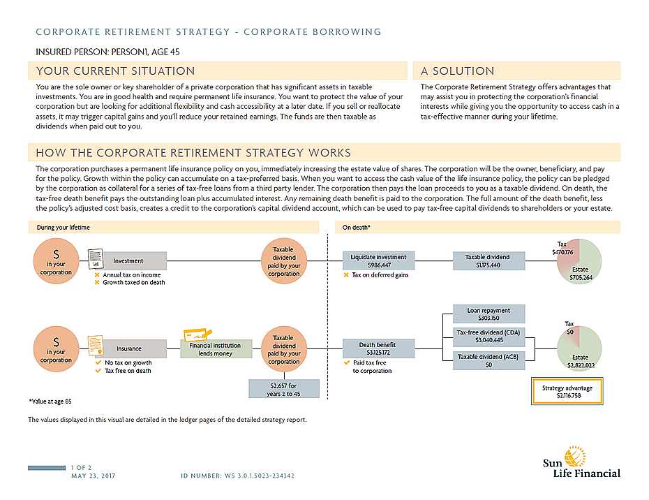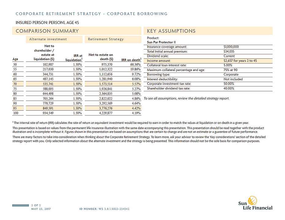 例如:有健康的身体和保险需求,45岁,男性,每年从企业的利润中投资$34,035到保险上, 企业税率50%, 投资20年,3%投资增长,每年取近$70,000, 能取到77岁。而运用个人退休策略,从66岁到85岁,每年用保单抵押贷款$70,000,到85岁时,即使减去所有贷款及利息,还可以给受益人留下$1,000,000. 参见如下Sun Life的分析说明