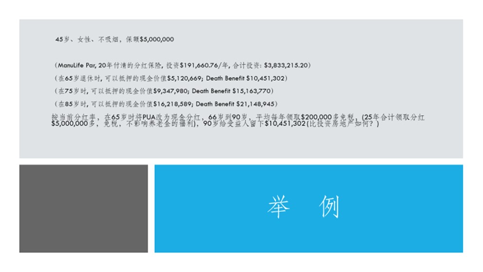 按当前分红率,在65岁时将PUA改为现金分红,66岁到90岁,平均每年领取$200,000多免税,(25年合计领取分红$5,000,000多,免税,不影响养老金的福利),90岁给受益人留下免税资产$10,451,302