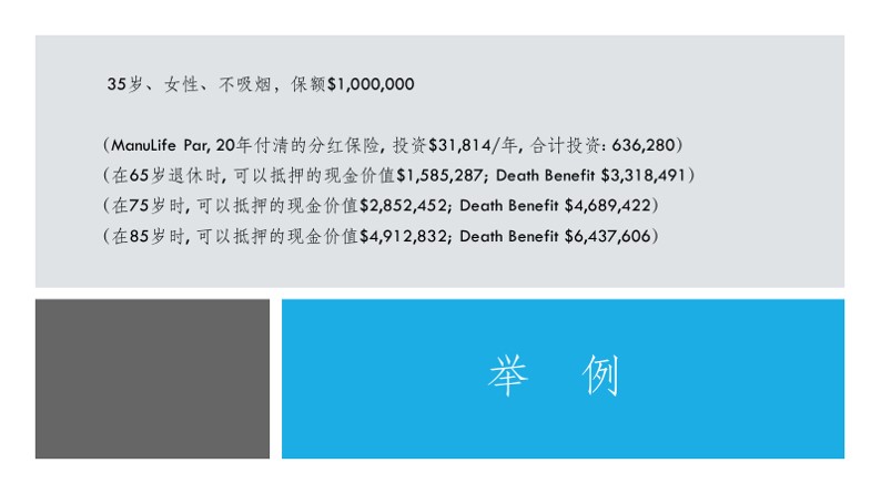 (在65岁退休时, 可以抵押的现金价值$1,585,287; Death Benefit $3,318,491)