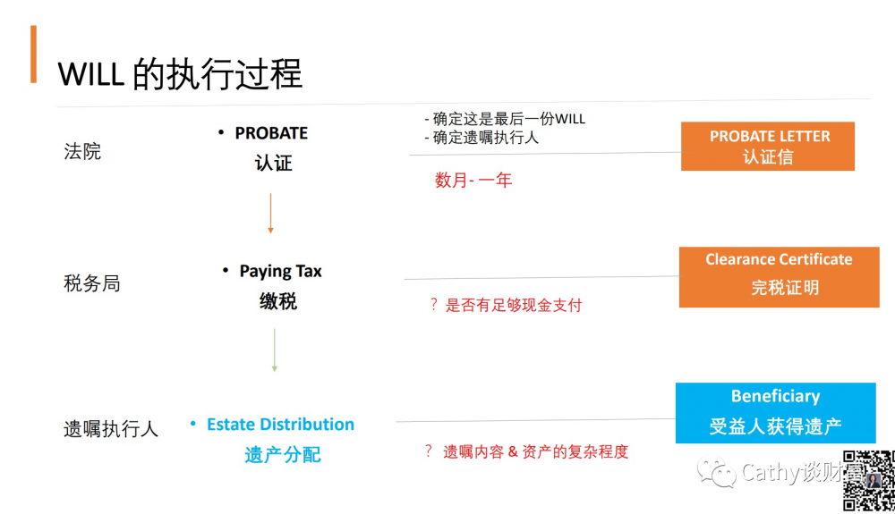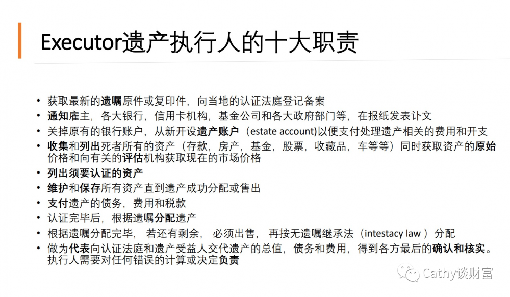 遗嘱一定要写明时间并表明这是最后也是最新的一份遗嘱,所以当这上面的3个要素:遗嘱执行人、资产和受益人发生变化时,都需要更新遗嘱。其中遗嘱执行人最好在加拿大,因为处理整个遗产过程顺利的话要半年,不顺利的话需要很久,如果人在中国肯定不方便。另外任命谁来做,也需要征得对方的同意,否则如果未来他放弃做遗嘱执行人,也会带来很大的麻烦。我们看看遗嘱执行人,到底要做哪些事?